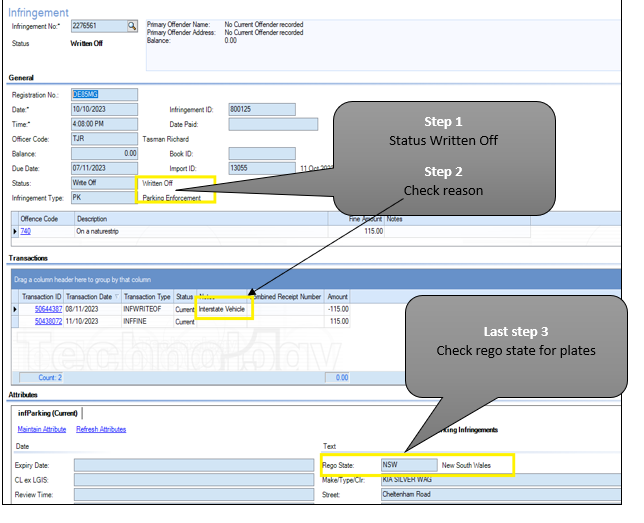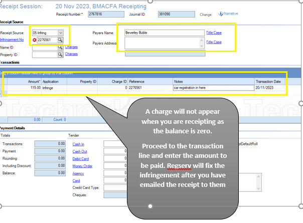 Infringements with At Summons or Summons Pending status CANNOT be receipted without authorisation from Council's Prosecutions Officer first(Rebecca Goddard).